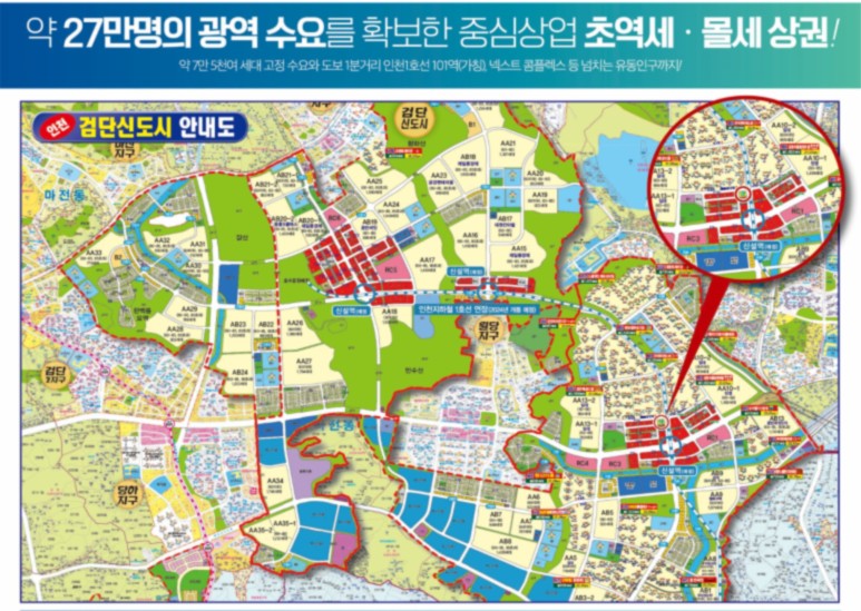 - 검단신도시(약18만명)와 인근 원당(약2만명), 풍무지구(약5만명)에 합계 약25만명이며 배후세대로는 약10만세대의 요충지에 위치.